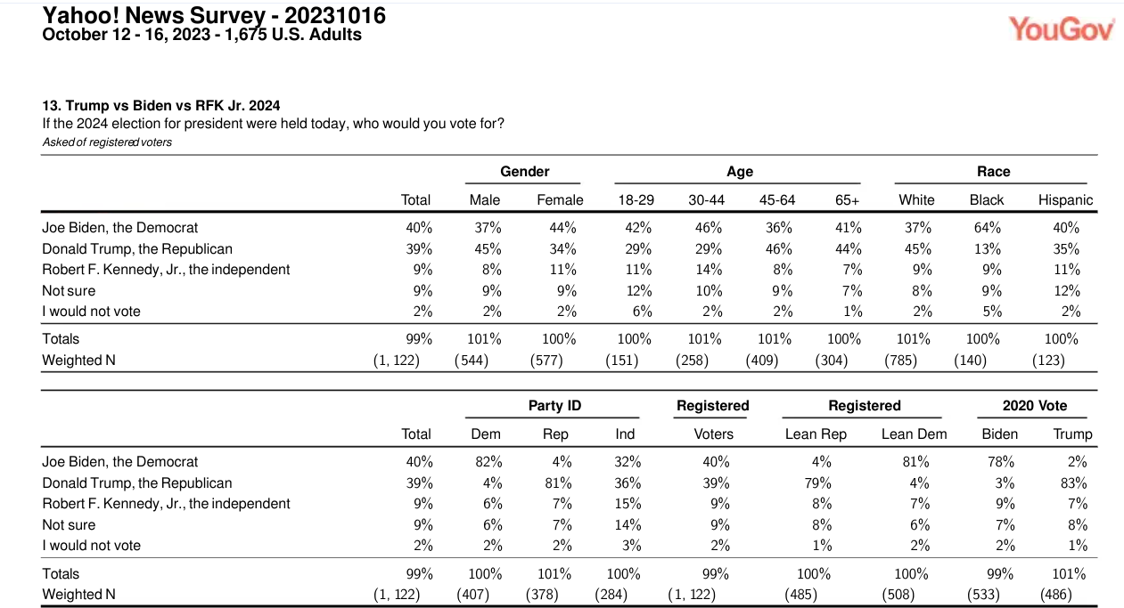 Yahoo News You Gov Crosstabs, Oct. 16, 2023