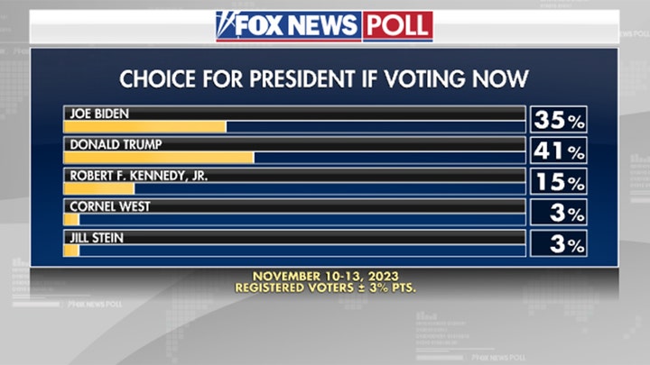 Trong tranh cử Tổng thống năm 2024 khi cạnh tranh giữa 5 người với cử tri ủng hộ Trump 40%, Biden 35% , Kenedy Jr. 13%, Machini 5% và Stein 4% theo cuộc thăm dò mới nhất của Fox News Poll trong tháng 11 năm 2023